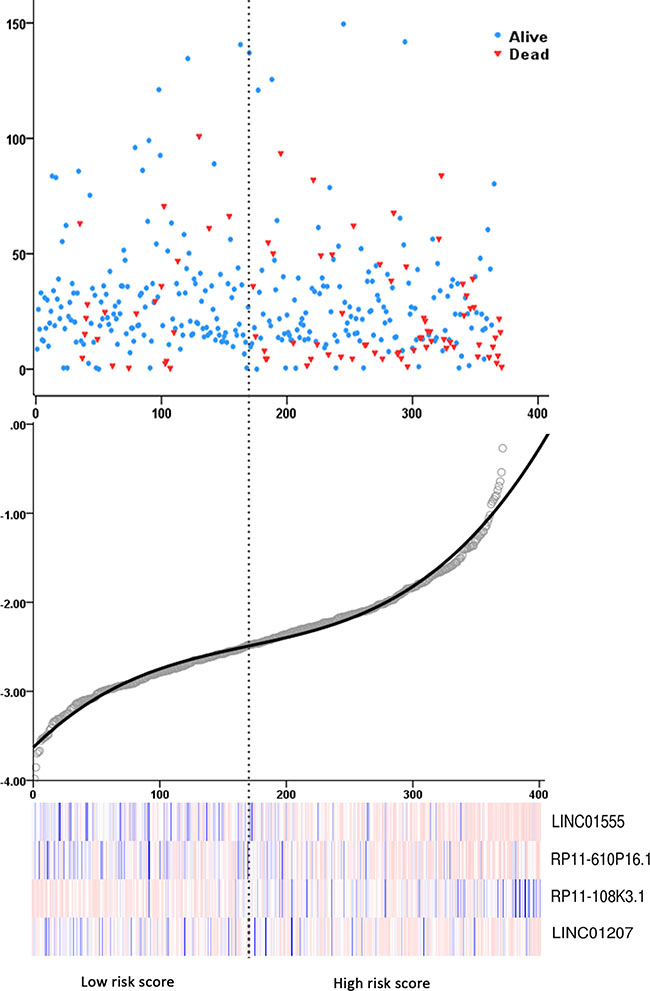 The relationship between aberrant lncRNAs and survival of colorectal cancer has been studied in small samples using distinct approaches. Li et al. [57] analyzed the prognostic value of 21 lncRNAs by PCR array in 30 colorectal cancer patients and reported that higher levels of AFAP1-AS1, BCAR4, H19, HOXA-AS2, MALAT1 or PVT1 and a lower level of ADAMTS9-AS2 could predict a poor prognosis of colorectal cancer patients. Similarly, Wang et al. [58] studied lncRNA expression profiling using microarray in six cases of colorectal cancer patients. Multivariate Cox analysis revealed that lncRNA NR_029373 and NR_034119 were both independently related to the disease-specific survival rate. Furthermore, Sun et al. [25] searched in GEO datasets and achieved five studies: GSE8671, GSE22598, GSE23878, GSE9348, and GSE37364, that studied lncRNAs in 150 cases of colorectal cancer patients. They found that one lncRNA, AK098081 could be considered an independent risk factor for colorectal cancer patients (HR = 1.896, 95% CI = 1.393–2.579, P < 0.001). Surprisingly, no consistent lncRNA has been verified by different groups, potentially due, at least in part, to the limited sample size and differing detection methods. Compared with previous studies, our study uses data from the TCGA database with high-throughput analysis of lncRNAs from a larger sample size. Herein, we report that expression of four novel lncRNAs (LINC01555, RP11-610P16.1, RP11-108K3.1 and LINC01207) could also become a new independent risk factor for colorectal cancer patients. Moreover, the risk score constructed from these four lncRNAs could be an indicator for the colorectal cancer patients in the clinical setting.