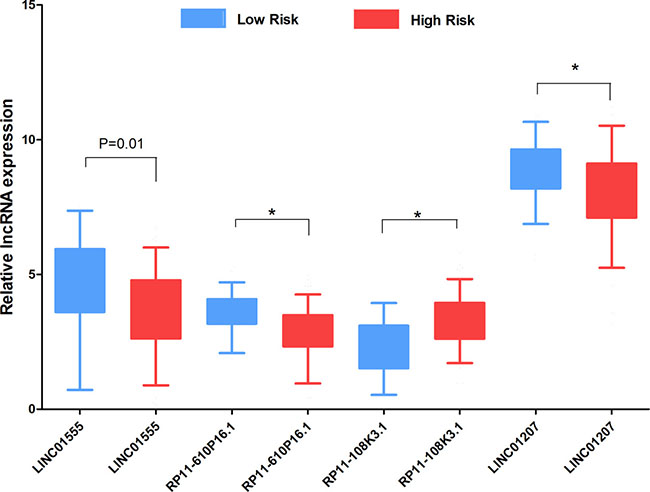Previous studies have verified that a lncRNA expression signature could be obtained from the database of The Cancer Genome Atlas (TCGA), which offers a platform for researchers to download and assess free public datasets [40–45]. Towards this, in the current study, the TCGA database was first applied to gather lncRNA gene expression profiles in COAD. By performing a comprehensive lncRNA expression profile assessment, we identified a lncRNA signature in COAD with four lncRNAs (LINC01555, RP11-610P16.1, RP11-108K3.1, and LINC01207), as a new candidate indicator with the potential to predict the OS in COAD patients. Furthermore, the prognostic value of this four-lncRNA-signature was validated in a READ cohort (Supplementary Figure 1).