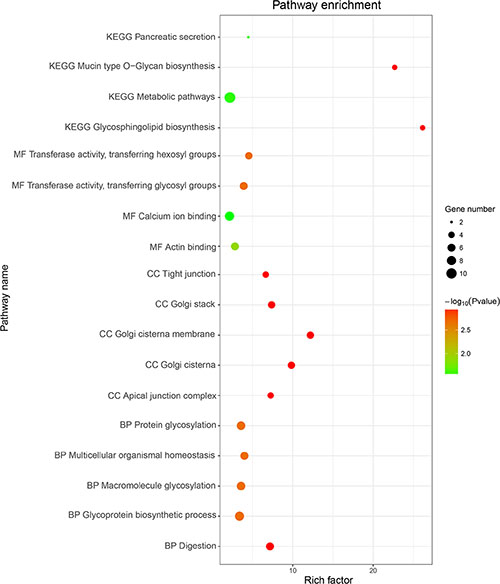 Figure 12: GO and KEGG term analysis of potential genes related to LINC01555 and LINC01207. The Rich factor shows the degree of enrichment, which was calculated by the formula: (the number of selected genes in a term/total number of selected genes)/(the total number of genes in a term of the database/ the total number of genes in the database). The Node size represents the number of selected genes, and color represents the p-value of the enrichment analysis. CC, cellular component; MF, molecular function; BP, biological process.