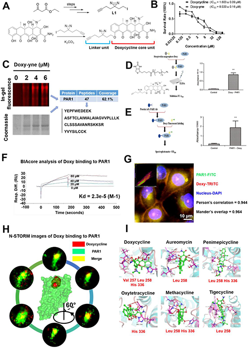 Figure 1: Design of the doxycycline probe and confirmation of doxycycline binding to PAR1. (A) Structure of the doxycycline probe used in this study. A portion of the doxycycline core unit and linker unit. (B) IC50 plots of doxycycline and doxycycline probe, as determined by the MTT assay. (C) Doxy-yne labeling of live cells and PAR1 pull-down with confirmation by MS. (D) Positive pull-down assays showing that the fluorescence of PAR1-Doxy was 100-fold greater than that of the control sample. (E) Reverse pull-down assays showing that the binding of doxycycline to PAR1 was 30-fold greater than that of the control sample. (F) Biacore analysis of doxycycline binding to PAR1 showing that doxycycline was captured by PAR1 with a Kd = 23 μM. (G) Confocal immunofluorescence imaging was performed to visualize PAR1 and doxycycline. PAR1 and doxycycline co-localize, with a Pearson’s correlation coefficient of 0.944 and a Mander’s overlap of 0.964. (H) N-STORM images of doxycycline bound to PAR1. These results show single molecules of doxycycline bound to PAR1, and 360-degree rotation reveals the combination image. (I) Binding mode of tetracyclines docked in the active site of PAR1. These results show that the entire tetracycline molecule occupies the binding pocket of PAR1 and that doxycycline demonstrates the strongest binding affinity and the lowest binding energy. Every experiment was repeated three times. The error bars represent the standard deviation (*P < 0.05, **P < 0.01). Data are represented as mean ± SEM. See also Supplementary Figure 1.