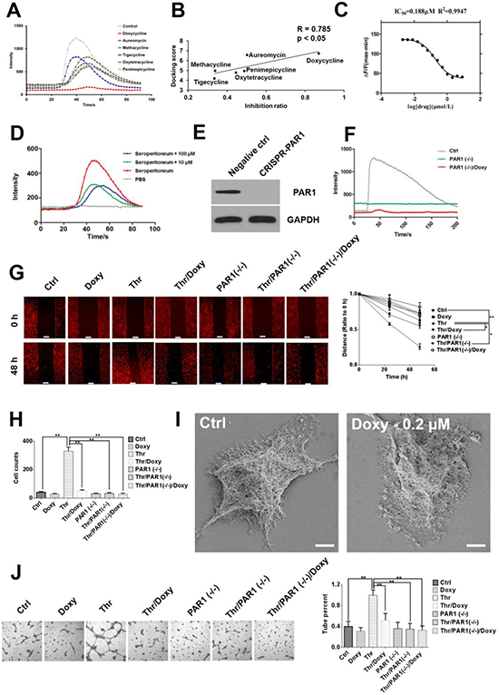 Figure 2: Doxycycline inhibits PAR1 and effectively decreases cancer cell malignancy. (A) Calcium influx signals in HEK-293-PAR1 cells treated with different tetracyclines (1 μM). All tetracyclines displayed inhibitory effects, among which doxycycline had the strongest inhibitory effect. (B) Regression analysis of the inhibition ratio and docking scores. The correlation coefficient between these two indexes was as high as 0.785 (P < 0.05). (C) Doxycycline inhibits calcium flow signals in a dose-dependent manner. (D) Doxycycline partially inhibits calcium flow signals stimulated by seroperitoneum with 10 and 100 μM. These results indicate that tetracyclines do not directly chelate calcium ions but rather inhibit PAR1 activity. (E, F) PAR1 knockdown by CRISPR and abrogates the sensitivity of cells to thrombin. (G) Doxycycline inhibits cell migration induced by thrombin under 1.6 μM in 48 h. (H) The cells were treated with doxycycline with 24 h under 1.6 μM and invasion ability were decreased. Invasion ability of PAR1(−/−) cells were decreased compared with normal cells. (I) Cells were treated with 0.2 μM doxycycline for 24 h. Scanning electron microscopy revealed a reduction in lamellipodia and filopodia compared with the control group. (J) Tube formation in thrombin-stimulated cells, doxycycline inhibit pipe formation ability with 1.6 μM. Results were obtained from three independent experiments, each performed in triplicate, and the error bars represent the standard deviation (*P < 0.05, **P < 0.01). Data are represented as mean ± SEM. See also Supplementary Figure 2.