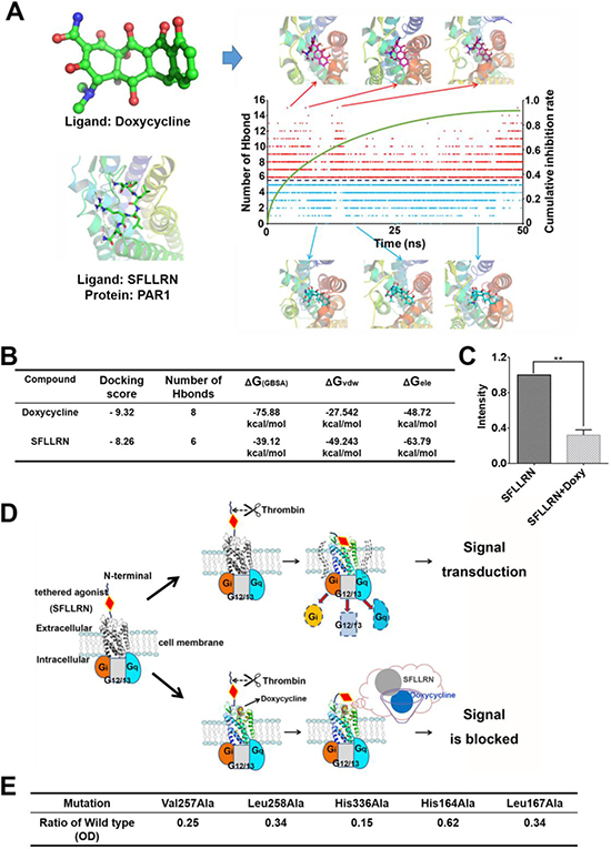 Figure 3: Molecular dynamic simulation and schematic diagram of the inhibitory mechanism showing direct interaction between doxycycline and PAR1. (A) Changes in the number of hydrogen bonds and typical conformations between PAR1 and doxycycline in our model system. Red dots indicate that the number of hydrogen bonds was greater than six; blue dots indicate that the number of hydrogen bonds was less than six. (B) Calculated results for the binding of doxycycline and SFLLRN to PAR1, indicating that doxycycline inhibition of PAR1 is more effective than activation of PAR1 by SFLLRN. (C) Calcium signaling assay for doxycycline and SFLLRN. These results reveal that doxycycline inhibits calcium influx caused by SFLLRN. (D) The mechanism underlying doxycycline inhibition of PAR1. Doxycycline occupies the active site of PAR1 and prevents “tethered agonist” activation, ultimately blocking signal transduction. (E) Mutation of PAR1 reveal key residues involved in doxycycline binding, which is consistent with the MD results. Results were obtained from three independent experiments, each performed in triplicate, and the error bars represent the standard deviation (*P < 0.05, **P < 0.01). Data are represented as mean ± SEM.