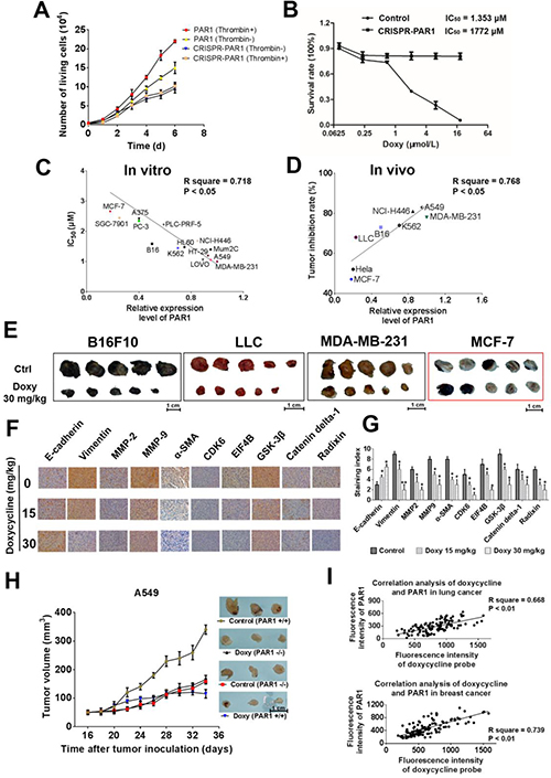 Figure 6: Doxycycline shows stronger inhibition and anti-tumor activity on cells with higher PAR1 expression. (A, B) Loss of sensitivity to doxycycline in PAR1 knockdown cells. (C) Liner regression analysis of the doxycycline inhibition rate and the PAR1 expression level. These results showed a positive correlation between the two indexes. (D) Regression analysis of the doxycycline anti-tumor rate and PAR1 expression levels; the correlation coefficient was 0.768. (E) Doxycycline treatment inhibits xenograft growth in numerous models with dose of 15 and 30mg/kg. (F) Immunohistochemical staining to identify EMT biomarkers and doxycycline inhibited proteins in treated and untreated cells. Doxycycline-treated cells display stronger E-cadherin and α-SMA staining but reduced vimentin, MMP-2 and MMP-9 staining; the expression levels of other proteins were identical to those observed by western blotting. (G) Staining indexes of EMT biomarkers and doxycycline inhibited proteins. (H) Tumor volume and sensitivity to doxycycline (30 mg/kg) in control (PAR1+) and PAR1 knockdown (PAR1-) cell lines. These results suggest that PAR1- cell lines lost their sensitivity to doxycycline. (I) Co-staining regression analysis of doxycycline and PAR1 in human tumor samples. These results show a clear positive correlation between the fluorescence intensity of doxycycline and PAR1. The regression analysis of the doxycycline staining intensity and pathological grading also showed a positive correlation. Results were obtained from three independent experiments, each performed in triplicate, and the error bars represent the standard deviation (*P < 0.05, **P < 0.01). Data are represented as mean ± SEM. See also Supplementary Figure 4 and Supplementary Figure 5.