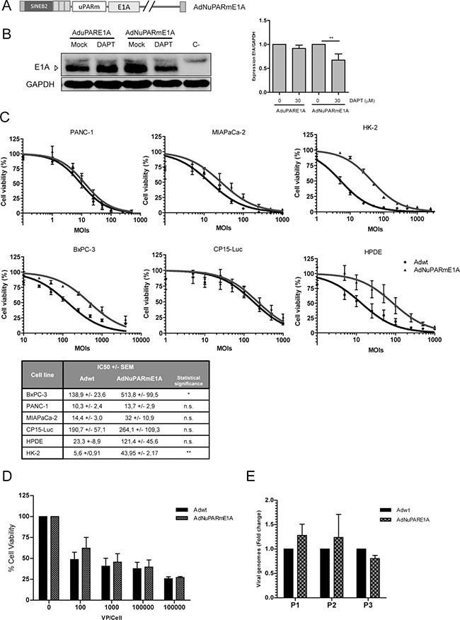 Figure 2: AdNuPARmE1A oncolytic adenovirus is regulated by the Notch pathway and displays a high oncolytic activity in pancreatic cancer models in vitro. (A) Schematic representation of the oncolytic adenovirus AdNuPARmE1A. Expression of the E1A adenoviral gene is controlled by the 3xSPSuPARm promoter. SINEB2 insulator sequence was cloned upstream the promoter sequence. (B) Western blot of E1A gene expression in BxPC-3 cells infected with AduPARE1A or AdNuPARmE1A (50 MOIs) and treated, or not, with 30 μM of DAPT for 48 h. Bar graph shows quantification of E1A expression normalized to GAPDH levels (right panel). Results are expressed as a mean +/– SEM of n = 7 independent experiments (*p < 0.05; **p < 0.01). (C) In vitro oncolytic activity of AdNuPAREmE1A compared to Adwt in PANC-1, BxPC-3, MIAPaca-2, CP15-Luc HPDE and HK-2 cell lines. Cells were seeded in triplicate and treated with a dose range of adenoviruses (vp/cell). Cell viability was measured 72 h post-infection by MTT assay and normalized to mock treated cultures. IC50 mean values +/– SEM of at least four independent experiments are represented at the table (*p < 0.05; **p < 0.01). (D) In vitro oncolytic activity of AdNuPAREmE1A compared to Adwt in CP15 tumorspheres. Cell viability was measured 72 h post-infection by WST-1 assay and normalized to mock treated cultures (n = 3 independent experiments). (E) Quantification of viral production in CP15 tumorspheres infected with AdNuPARmE1A or Adwt upon several passages by qPCR. Results are expressed as the mean of relative viral genomes +/– SEM of three independent experiments.