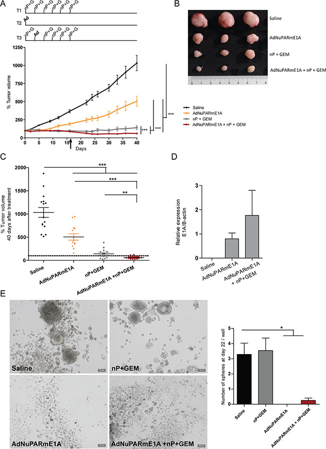 Similar experiments were also conducted in a more relevant model of pancreatic cancer, such as the CP15-PDX. Chemotherapy treatment was stopped by day 16 but tumor growth was follow up to day 40. Groups receiving chemotherapy either alone or in combination with AdNuPARmE1A showed a similar antitumor efficacy, during the treatment period. Although both groups displayed a good control in tumor growth until the end of the experiment, the group treated with the triple combination showed higher efficacy (Figure 5A). Macroscopic analyses evidenced a clear reduction in tumor size especially in the groups of the chemotherapy and triple combination treatments (Figure 5B). The largest reduction in tumor volume was observed in the virus plus chemotherapy regimen (Figure 5B, 5C). Analysis of E1A expression in the tumors, revealed that we could still detect adenoviral activity after 40 days treatment and a slightly increased in E1A expression was observed in the triple combination treatment (Figure 5D). We also assessed the effects of the treatment on the pancreatic cancer stem cell population by analyzing tumorsphere formation from the treated tumors. Tumorsphere forming capacity was significantly impaired in tumors treaded with AdNuPARmE1A either alone or in combination. However, chemotherapy treatment alone led to tumorsphere formation at similar numbers as the saline group (Figure 5E). These results demonstrate the abilitiy of the chimeric promoter NuPARm to induce the viral replication and the cell death in pancreatic neoplastic cells as well as in cells with stem cell features. Thus, the combined treatment AdNuPARmE1A + GEM+nP resulted in the largest antitumor effect and was able to target pancreatic cancer stem cells.