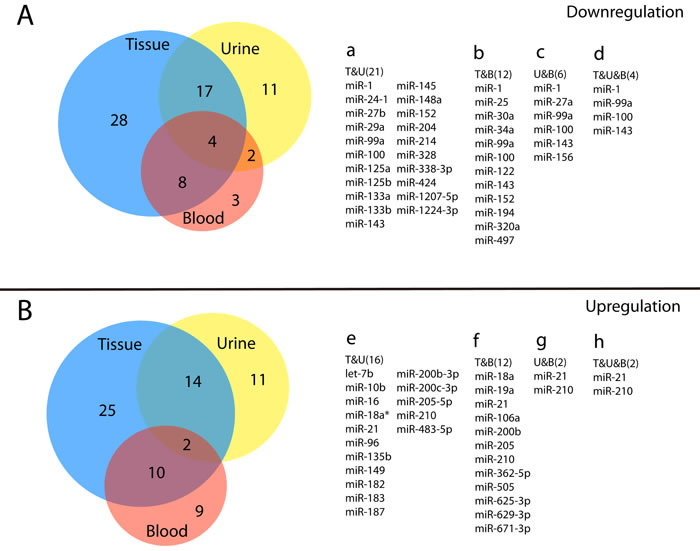 Table 1: Dysregulated miRNAs among different biological samples reported by multiple studies in bladder cancer