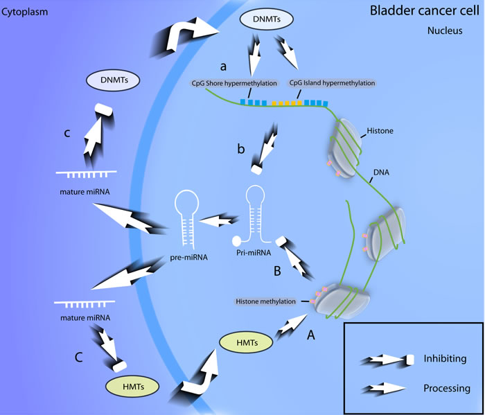 In this review, we summarize the current studies on changes in miRNA expression in bladder tumour tissues and urine samples as well as blood collected from patients, and we analyse the aberrantly regulated biogenesis network of BCa-related miRNAs from different angles. We deeply discuss their dysregulations in terms of coding genes, primary transcript processing, pre-miRNA maturation, the miRNA-mRNA binding process and the core components in miRNA biogenesis machinery. In this way, we reveal that an impaired biogenesis network in bladder cancer may lead to wide changes in miRNAs and eventually induce carcinogenesis and the development of BCa.