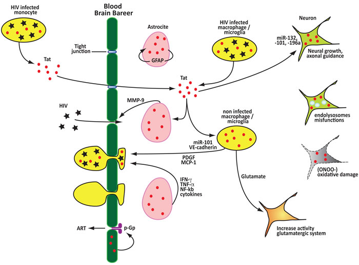 An additional role of Tat in the development of neurocognitive disorders might be connected to the low levels of ART observed in the brain of patients [125]. Tat has been shown to increase the promoter activity and expression of the P-glycoprotein (P-gp) [126], a pump present in the cells forming the BBB and required for the transport of small molecule out of the brain. It is plausible that Tat might help in establishing a brain reservoir of HIV by up-regulating P-gp, thus removing ART from the CNS.