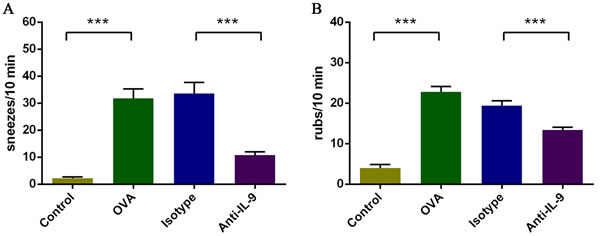 Figure 1: Inhibition of nasal symptoms resulting from IL-9 blockade. A. Sneezing symptom score. B. Rubbing symptom score. ***P < 0.05.