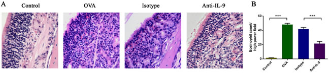 Figure 2: Anti-IL-9 Abs reduced the infiltration of eosinophils in the nasal mucosa. Representative photomicrographs (original magnification ×200) of nasal mucosal sections from mice, stained with hematoxylin and eosin (H&E) for eosinophils A. Significantly greater numbers of eosinophils B. were observed in the OVA group than in the control group, and this increase was obviously alleviated by anti-IL-9 Ab treatment. ***P < 0.05.