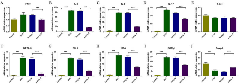 Figure 4: The effect of IL-9 blockade on the mRNA expression of Th cell-related cytokines and T-cell subset transcription factors in the nasal mucosa, analyzed with real-time PCR. The relative levels of Il-4, Il-9, Il-17, Gata3, PU.1, Irf4 and Rorγt mRNA B., C., D., F., G., H., and I. were significantly greater in the OVA group than in the control group, and this upregulation was markedly inhibited by anti-IL-9 Abs. Ifn-γ mRNA levels were moderately but not significantly greater in the OVA group than in the control group, but were significantly downregulated with anti-IL-9 Abs A. There was no significant difference in T-bet mRNA levels among the groups (E). Foxp3 mRNA levels were significantly lower in the OVA group than in the control group, and were significantly upregulated with anti-IL-9 Abs J. ***P < 0.05.