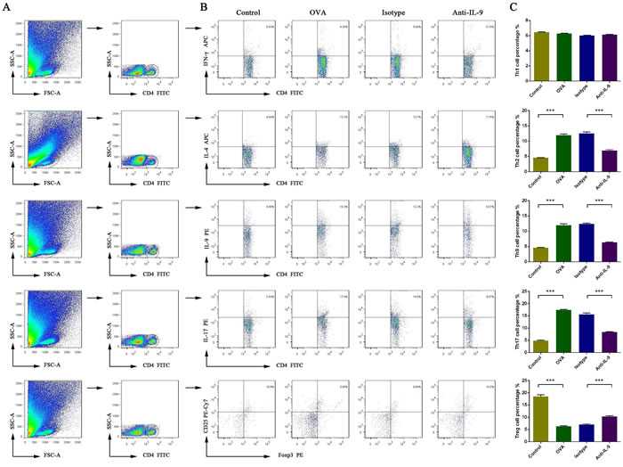 Our results indicate that the ratios of Th2, Th9, and Th17 cells increased, while the proportion of Treg cells decreased, in the AR state. After anti-IL-9 treatment, the proportion of Th2, Th9, and Th17 cells decreased, whereas the proportion of Treg cells increased, but the proportion of Th1 cells did not change significantly. Thus, in AR, Th2, Th9, Th17, and Treg cells are important components of lymphoid immunity.
