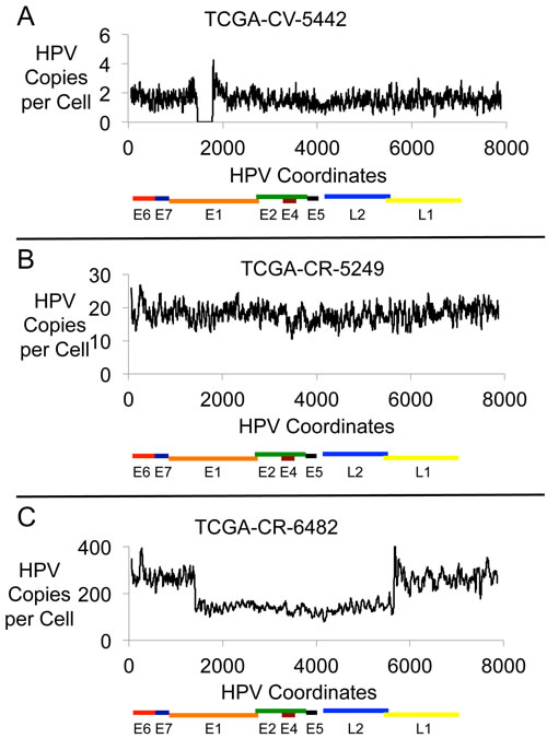 Figure 1: HPV16 Genomic DNA Profiles. Plots are shown for three HNC samples with HPV16 DNA showing the HPV DNA present in each sample in copies per cell. The results displayed are based on the content for a 20-base interval across the 7904 bp HPV16 genome. The three samples are: A. TCGA-CV-5442, B. TCGA-CR-5249, and C. TCGA-CR-6482.
