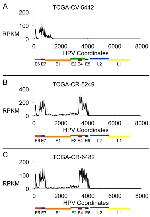 Figure 2: HPV16 RNA Expression Profiles. Plots are shown for three HNC samples with HPV16 DNA showing the HPV RNA sequence expression in each sample in units of Reads Per Kilobase per Million (RPKM). The results displayed are based on the content for a 20-base interval across the 7904 bp genome. The three samples are: A. TCGA-CV-5442, B. TCGA-CR-5249, and C. TCGA-CR-6482.