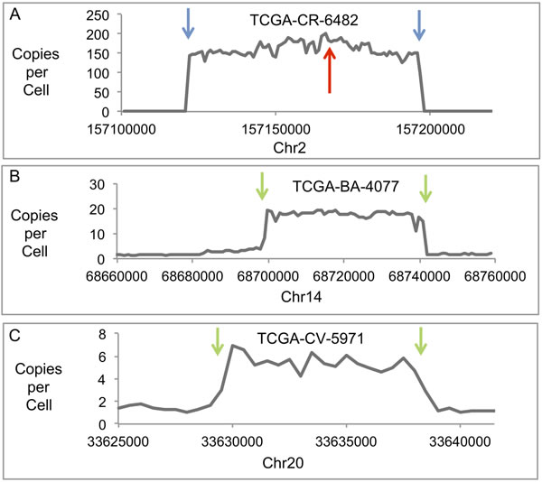 Figure 3: Human Genomic DNA Profiles of Amplified Regions. Plots are shown of copies per cell for three human DNA regions with junctions to HPV DNA and amplification in three different samples. The results displayed are based on the DNA content for a 1000-base interval across the genomic region shown for TCGA-CR-6482 and TCGA-BA-4077, and a 500-base interval for TCGA-CV-5971. A. Plot shows a region of Chr2 amplified in TCGA-CR-6482. The red arrow indicates the site of HPV recombination with human DNA and junctions between HPV and human DNA. The blue arrows indicate the sites for the ends of the human DNA amplicon and the sites that have recombined with each other to form an excision junction. B. Plot shows a region of Chr14 amplified in TCGA-BA-4077. The green arrows indicate the sites of the ends of the human DNA amplicon and the sites that have recombined with HPV DNA to form HPV-human DNA junctions. C. Plot shows a region of Chr20 amplified in TCGA-CV-5971. The green arrows indicate the sites for the ends of the human DNA amplicon and the sites that have recombined with HPV DNA to form HPV-human DNA junctions.