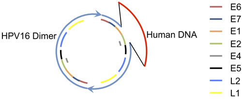 Figure 4: A Proposed Structure for the HPV Dimer Human DNA Hybrid Episome. A circular structure with HPV16 and human DNA is shown. Two copies of HPV DNA are linked as a dimer in direct tandem, shown in blue. A partial deletion in one copy of the HPV genome is shown as a gap. Human DNA, shown in red, is joined to the HPV DNA at the sites of the partial deletion. Regions for the HPV genes are shown as color-coded bars.