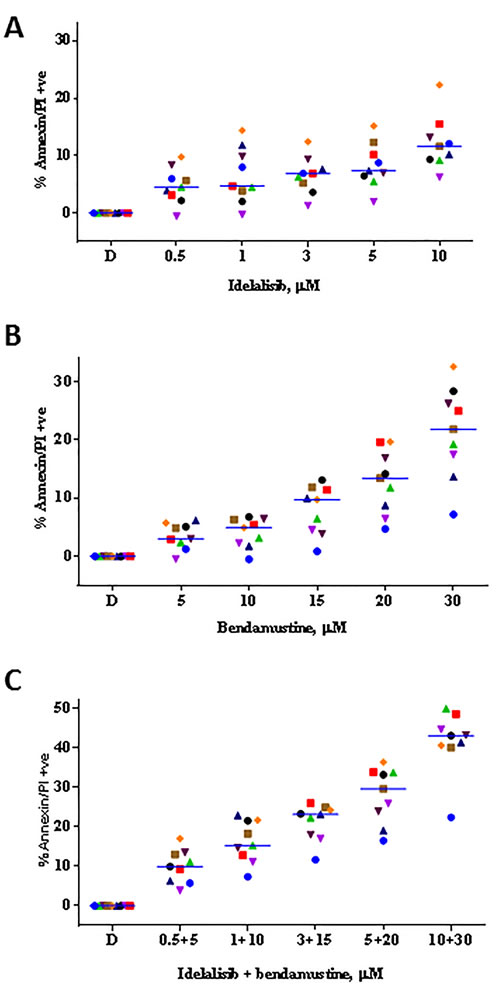 For apoptotic assay, primary CLL cells were untreated or treated with idelalisib, bendamustine, or combination and stained with Annexin V and propidium iodide and counted using flow cytometry, as described previously. [56] Cells in all three quadrants (early apoptosis, late apoptosis, and necrosis) were included to obtain percent total cell death.