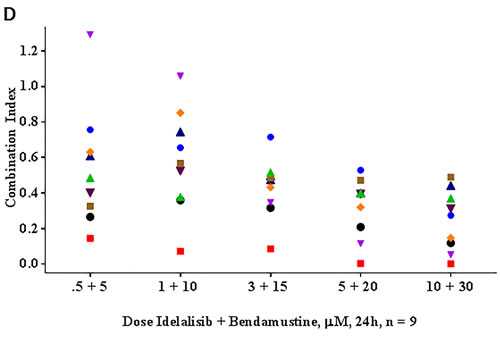 Figure 1: Idelalisib and bendamustine combination results in synergistic cytotoxicity. A. Dose-dependent cytotoxicity of idelalisib alone or B. bendamustine alone or C. both in combination. Freshly isolated chronic lymphocytic leukemia (CLL) cells from 9 patients were incubated with the indicated concentrations of single agent idelalisib A., single agent bendamustine B., or both agents C. simultaneously for 24 hours. Cells were harvested and then stained with Annexin V/PI. The level of apoptosis for each treated sample was detected using flow cytometry, and the apoptotic cells were indicated by the cell population in the lower right, upper right, and upper left quadrants. The values were represented as percent control to untreated time matched control (DMSO; D) samples. Each colored symbol represents a CLL patient sample (CLL516, CLL944, CLL267, CLL109, CLL973, CLL781, CLL247, CLL661, and CLL112). Horizontal bar for each concentration represents median value. D. Evaluation of the combination index (CI) for the idelalisib and bendamustine combination. The apoptotic population from the combination treatment C. was used for fractional analysis. Calcusyn software was used for an output of the CI calculated by the fraction affected and the non-constant ratios of the drugs. The calculated combination index (CI) < 1, = 1, and > 1 indicate synergistic, additive, and antagonistic interactions, respectively. Abbreviation: h, hours.