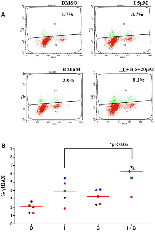 Bendamustine is an alkylating agent known to induce DNA damage response. γH2AX is a prominent marker of DNA damage response [17] and could be measured using flow-cytometry assay as shown in the plots (Figure 2A). CLL primary cells were either untreated or treated with idelalisib alone, bendamustine alone or combination. Control i.e. DMSO only treated CLL lymphocytes showed a minimal positivity for γH2AX. Compared to the control, single agent idelalisib and single agent bendamustine demonstrated increased γH2AX. Furthermore, when both drugs were incubated simultaneously, the combination treatment significantly enhanced DNA damage response, according to both flow cytometry (Figure 2B) and immunoblot analysis (Figure 2C). When CLL primary cells were stimulated with αIgM, there was a slight decrease in DNA damage response (Figure 2C).