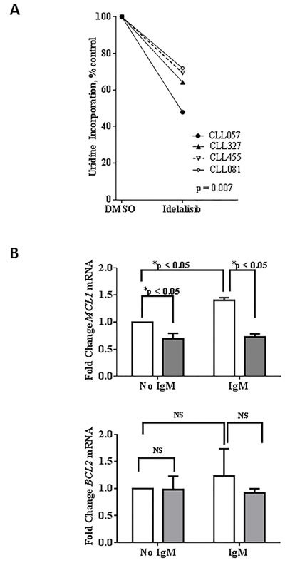Consistent with previous studies of PI3Kα and β isoforms, [18] we found that idelalisib-treated cells had significantly less global RNA synthetic capacity than control cells (47%-71% decrease; n = 4; Figure 3A). We next examined which particular mRNA transcripts are being depleted with idelalisib treatment. In CLL, MCL1 and BCL2 are the members of the BCL2 family antiapoptotic proteins, [19]. Our results showed that, in unstimulated cells, idelalisib treatment significantly decreased MCL1 mRNA expression (by 30%); Of note, MCL1 mRNA expression was increased by IgM stimulation, but decreased again with idelalisib treatment (Figure 3B; upper panel). In contrast, BCL2 mRNA expression did not change significantly (Figure 3B; lower panel).