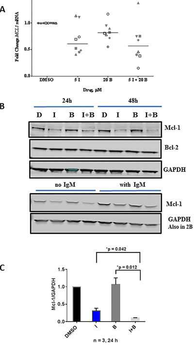 Figure 5: Comparison of single agent idelalisib, single agent bendamustine to combination regimen on MCL1 transcript and Mcl-1 protein levels. A. Primary cells were treated with DMSO, idelalisib (I, 5 µM) or bendamustine (B, 20 µM) alone, or in combination. Cells were harvested, and total RNA was extracted and analyzed by real-time RT-PCR with primers and probe for the MCL1 mRNA transcript. MCL1 gene expression was measured and normalized to the 18S ribosomal RNA as an endogenous control, and each experiment was normalized to the DMSO control. The data are from 8 CLL patients (CLL516, CLL068, CLL454, CLL483, CLL354, CLL203, CLL653, and CLL075). Horizontal bar represents median value. B. Effect of idelalisib and bendamustine combination treatment on apoptotic protein levels in primary CLL cells. Primary cells were treated with DMSO, idelalisib (I, 5 µM) or bendamustine (B, 20 µM) alone, or in combination (5 µM I + 20 µM B) for 24 hours and 48 hours. Cells were harvested, and protein lysates were analyzed using immunoblots to detect the protein levels of Mcl-1 and Bcl-2. GAPDH was used as a control for equal protein loading. The lower immunoblot represents cells treated with or without IgM (same extract used in Figure 2B) and tested for γH2AX. This immunoblot was from the same gel as in Figure 2B and hence same GAPDH is used. C. Immunoblots for three patient samples (from Figure 5B) were quantified by measuring the ratios of Mcl-1 and Bcl-2 to GAPDH for idelalisib- and bendamustine-treated samples, and these values were normalized to the DMSO control. Paired t-test was used to determine p values.
