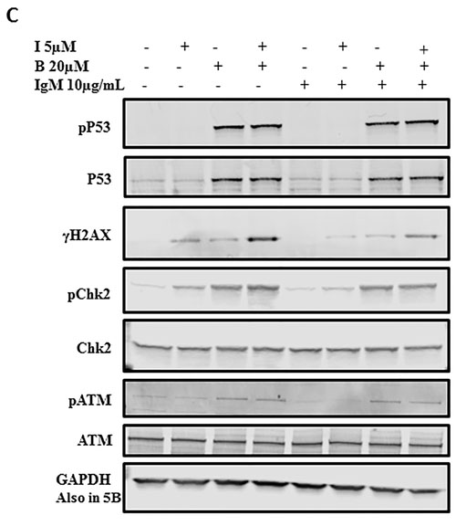 Figure 2: Idelalisib and bendamustine combination results in enhanced DNA damage response. A.. Induction of γH2AX (measure of DNA damage response) after treatment with idelalisib, bendamustine, or the combination. Primary cells were treated with DMSO (D), idelalisib (I, 5 µM) alone, bendamustine (B, 20 µM) alone, or both idelalisib and bendamustine (5 µM + 20 µM, respectively) for 24 hours. The cells were then harvested, fixed with ethanol, incubated with goat serum for 1 hour, and probed with the primary antibody γH2AX. Cells were washed and then co-incubated with PI and DNase-free RNase and analyzed for fluorescence signal on flow cytometry for DNA damage response. Fluorescent cells, with an upward shift were marked as γH2AX-positive cells. B.. Data similar to that in Figure 2A were collected from 5 patients with CLL (CLL514, CLL455, CLL327, CLL137, and CLL103). Horizontal bar represents median value. The significance of the differences between treatment groups was determined by a paired 2-tailed Student t-test. C.. Effect of idelalisib, bendamustine, and combination treatment on DNA damage proteins in CLL cells. Primary cells were either unstimulated or stimulated with αIgM (10 µg/mL) for 30 minutes. The cells were then treated with DMSO, idelalisib alone (5 µM), bendamustine (20 µM) alone, or both idelalisib and bendamustine (5 µM + 20 µM, respectively) for 24 hours. Cells were harvested, lysed and analyzed using immunoblot technique to detect the protein levels of phospho- and total-p53, γH2AX, phospho- and total-Chk2, and phospho- and total-ATM. Glyceraldehyde 3-phosphate dehydrogenase (GAPDH) was used as a control for equal protein loading.