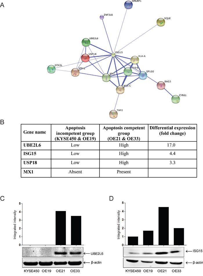 We previously evaluated the response of four esophageal cell lines to drug treatment [5]. Two cell lines (OE21 and OE33) exhibited both apoptosis and autophagy and are relatively drug sensitive. In contrast, two cell lines (KYSE450 and OE19) fail to undergo apoptosis in response to drug treatment and instead, respond by inducing autophagy alone. These cell lines are more drug resistant and can recover following drug withdrawal. We reasoned that these two groups may differ in the genes that they constitutively express, and this may affect their response to cytotoxic stress. We conducted Affymetrix gene array analysis of all four cell lines in triplicate. The array hybridisation and bioinformatics was carried out by Almac Diagnostics (www.almac.com; methods are included in Supplementary Figure 1). We initially identified a list of genes that were common to group A (apoptosis & autophagy cells) and a separate list of genes that were common to group B (autophagy only cells). Each group contained one adenocarcinoma and one squamous cell carcinoma cell line. Genes which differed due to histological subtype were eliminated at this stage. We then looked for genes that are always expressed in the same direction in Group A (apoptosis & autophagy competent) but differentially expressed in Group B. 260 genes had more than a three-fold difference in the level of expression between the apoptosis competent (OE21, OE33) and apoptosis incompetent, autophagy only (KYSE450 and OE19) cell lines. Biological data on these genes was assimilated and STRING analysis was used to look for associated protein networks. One of the nodes identified by STRING included the most differentially expressed gene (UBE2L6; 17-fold differential) and several other members of the ISGylation network including ISG15 itself (Figures 1A and 1B). We therefore selected UBE2L6 and ISG15 for further analysis. Differential expression in the cell lines was confirmed by Western blot. These data confirm a significant difference in UBE2L6 and ISG15 protein expression between the apoptosis competent and apoptosis incompetent cell lines (Figures 1C and 1D).