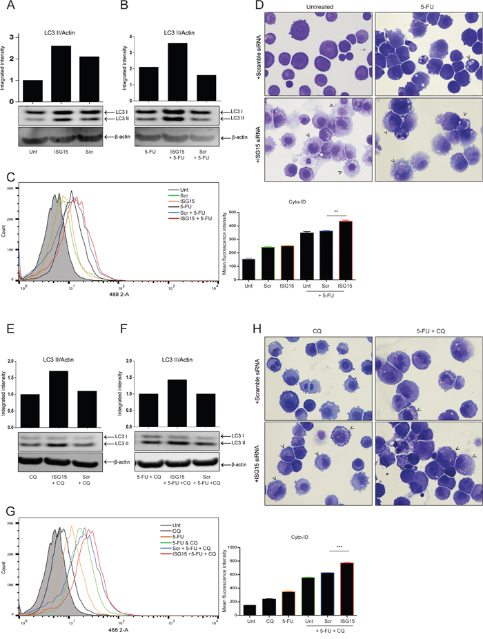 Figure 3: ISG15 silencing with siRNA promotes both endogenous and induced autophagic flux. For all autophagy assays - OE21 cells were treated for 24 hr and allowed to recover for an additional 24 hr in drug free medium. The effect of ISG15 siRNA (middle lanes) on A. endogenous LC3 II and B. 5-FU-induced (30 μM) LC3 II, relative to untransfected (left lanes) and scrambled control (right lanes) was assessed by Western blot. C. Cyto-ID autophagy detection kit was used to assess autophagosome formation by ISG15 siRNA alone (orange overlay) relative to scrambled (green overlay) or untreated cells (grey filled histogram). 5-FU-induced autophagy was assessed in ISG15 depleted cells (red overlay) relative to scramble control (blue overlay) (**p < 0.005) or untransfected (black overlay) cells. D. Analysis of vesicle accumulation (black arrowheads) in scrambled (upper panels) and ISG15 siRNA (lower panels) cells, without (left panels) and with 5-FU (right panels) (40x magnification). E. Autophagic flux was assessed by measuring LC3 II levels in untransfected (left lanes), scrambled control (right lanes) and ISG15 siRNA (middle lanes) cells following 24 hr treatment with chloroquine (10 μM) alone or F. in combination with 5-FU (30 μM). LC3 II levels were normalised to β-actin and presented as integrated intensities. Western blots shown in parts A, B, E & F are all from the same blot G. Cyto-ID assay was used to assess 5-FU-induced autophagic flux in ISG15 depleted (red overlay), scramble control (blue overlay) (***p < 0.0001) and untransfected (green overlay) cells, treated with 5-FU and chloroquine. H. Induction of vesicles was confirmed by morphological analysis (black arrowheads, 40x magnification) following transfection with scrambled control (upper panels) or ISG15 siRNA (lower panels) in cells treated with chloroquine alone (left panels) or in combination with 5-FU (right panels).