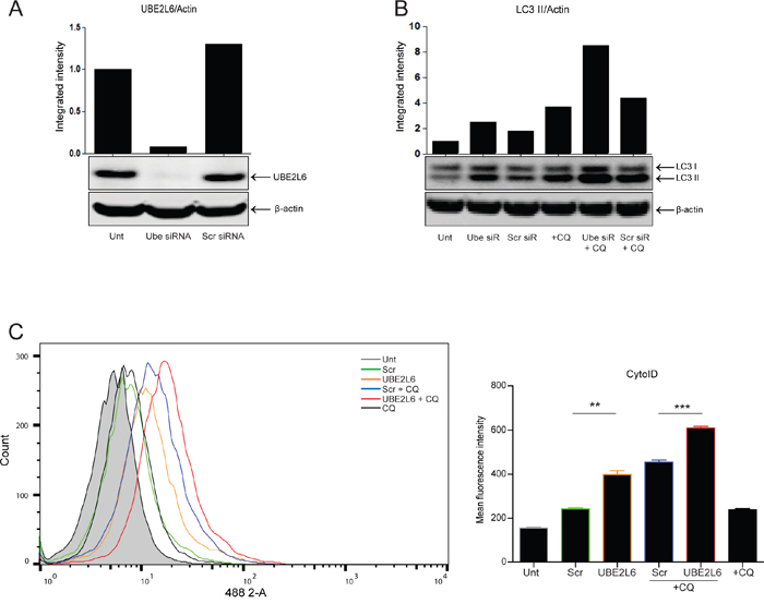 Figure 4: UBE2L6 siRNA promotes endogenous autophagy induction. A. Silencing of UBE2L6 by siRNA (20 nM) was confirmed by Western blot. B. Induction of autophagy was evaluated by Western blot analysis of LC3 II levels normalised to β-actin for untreated (lanes 1-3) or 24 hr chloroquine (10 μM) treated cells (lanes 4-6) in the presence of UBE2L6 siRNA (lanes 2 & 5). C. Cyto-ID was used to assess autophagosome formation by UBE2L6 siRNA alone (orange overlay) relative to scrambled (green overlay) or untreated (grey filled peak). Flux was analysed in UBE2L6 siRNA cells (red overlay) and compared with scrambled siRNA control (blue overlay). Data from three independent experiments is presented to the right as mean fluorescence intensities ± SEM (**p < 0.005, ***p < 0.0005).