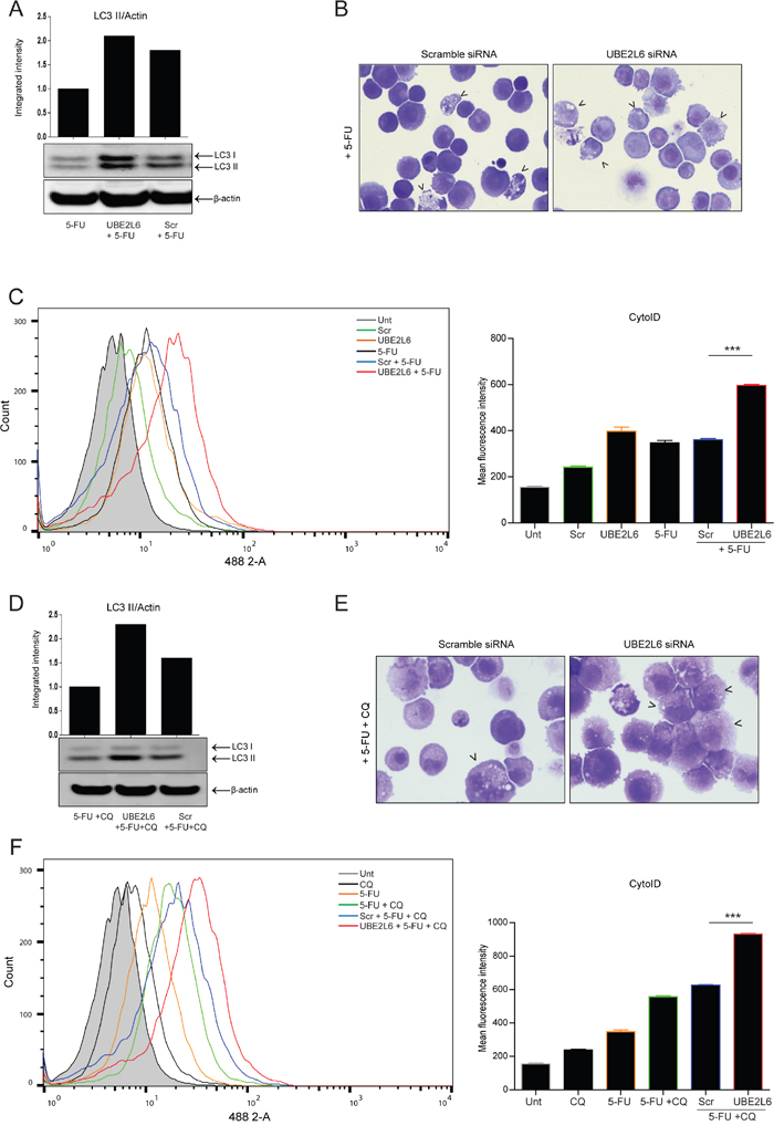 Figure 5: UBE2L6 siRNA enhances 5-FU-induced autophagic flux. A. The effect of UBE2L6 siRNA (middle lane) on autophagy induction relative to untransfected or scrambled controls (left and right lanes respectively) following treatment with 5-FU (20 μM) for 24 hr was assessed by Western blot. B. Morphological analysis (40x magnification) compares vesicle accumulation (black arrowheads) in scrambled siRNA control cells (left panel) to UBE2L6 siRNA cells (right panel) following treatment with 5-FU. C. Cells treated with 5-FU (black overlay) were stained with Cyto-ID. Autophagosome formation was assessed in drug treated cells with UBE2L6 siRNA (red overlay), relative to scramble controls (blue overlay). Data from three independent experiments is presented as mean fluorescence intensity ± SEM to the right (***p < 0.0001). D. To assess flux, cells were treated with chloroquine (10 μM) in combination with 5-FU for 24 hr in the presence of either scrambled (lane 3) or UBE2L6 siRNA (lane 2). LC3 II levels were normalised to β-actin. Western blots shown in parts A & D are from the same blot E. Morphology of cells treated with a combination of 5-FU and chloroquine was compared in scrambled control cells (left panel) and UBE2L6 siRNA cells (right panel). Autophagic vesicles are indicated by black arrowheads (40x magnification). F. The effect of UBE2L6 siRNA on autophagic flux was assessed by treating cells with either 5-FU (orange overlay) or chloroquine (black overlay) alone or a combination of both (green overlay) in the absence (blue overlay) or presence (red overlay) of UBE2L6 siRNA. Mean Fluorescence Intensities of three independent experiments are shown to the right (***p < 0.0001).