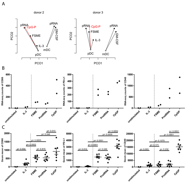 Figure 6: Assessment of CpG-P as a clinical-grade stimulus. A. PCoA of pDCs of donor 2 and 3 with CpG-P data included in the figure. Each point represents the transcriptome of the respective condition and the analysis was based on the first and second coordinate. B. Upregulation of the maturation markers on pDCs at RNA-seq level upon indicated stimuli (n=2). Upregulation of the maturation markers on pDCs at protein level upon the indicated stimuli (n=7).