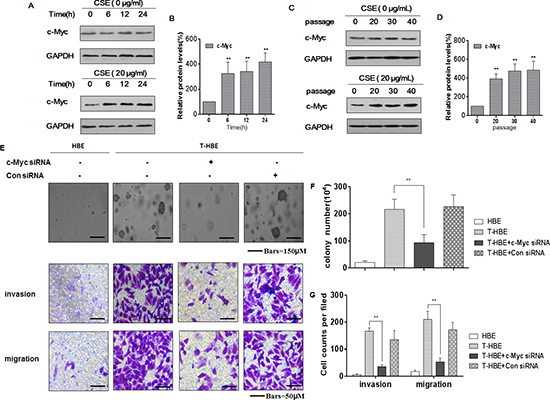 Figure 1: CSE increases the levels of c-Myc, affecting the degree of malignancy and the invasion/migration capacity of transformed HBE cells. Abbreviations: HBE, passage-control HBE cells; T-HBE, CSE-transformed HBE cells. Densities of bands were quantified by Eagle Eye II software. GAPDH levels, measured in parallel, served as controls. HBE cells were exposed to CSE (0 or 20 μg/mL) for 0, 6, 12, or 24 h. (A) Western blots were performed, and (B) relative protein levels (means ± SD, n = 3) of c-Myc were determined. ** P < 0.05, different from control HBE cells. HBE cells were exposed to 0 or 20 μg/mL CSE for 0, 20, 30, or 40 passages. (C) Western blots were performed, and (D) relative protein levels (means ± SD, n = 3) of c-Myc were determined. *P < 0.05, different from passage-control HBE cells. T-HBE cells were transfected for 24 h with c-Myc siRNA or control siRNA at a final concentration of 100 ppm. (E) Representative images of colony formation in soft agar (upper, bars = 150 μm), cell invasion (middle, bars = 50 μm), and cell migration (lower, bars = 50 μm) were prepared. The numbers (means ± SD, n = 3) of colonies formed (F) and of invading or migrating cells (G) were quantified. **p < 0.05, different from T-HBE cells in the absence of c-Myc siRNA.