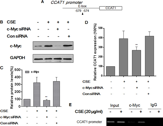 Figure 3: c-Myc regulates CCAT1 expression by binding to the promoter of CCAT1 in HBE cells. Densities of bands were quantified by Eagle Eye II software. GAPDH levels, measured in parallel, served as controls. (A) Schematic graph illustrating binding sites of c-Myc in the promoter of CCAT1. HBE cells were exposed to CSE (0 or 20 μg/mL) in the absence or presence of 100 ppm c-Myc siRNA or control siRNA for 24 h. (B) Western blots and (C) relative protein levels (means ± SD, n = 3) of c-Myc were determined. (D) The levels (means ± SD, n = 3) of CCAT1 were determined by quantitative RT-PCR. **P < 0.05, different from CSE-treated HBE cells in the absence of the c-Myc siRNA. HBE cells were exposed to CSE (0 or 20 μg/mL) for 24 h. (E) the binding of c-Myc to promoters of CCAT1 was measured by a ChIP assay after chromatin was immunoprecipitated with an antibody against c-Myc.