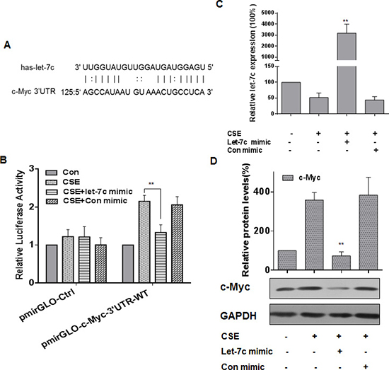 Figure 4: let-7c is involved in CSE-induced increases of c-Myc expression in HBE cells. Densities of bands were quantified by Eagle Eye II software. GAPDH levels, measured in parallel, served as controls. (A) Schematic graph of the binding sites of let-7c in the 3′UTR of c-Myc. HBE cells were exposed to CSE (0 or 20 μg/mL) for 24 h after they were transfected with 50 nM let-7c mimic or control mimic for 24 h. HBE cells were co-transfected with pmirGLO-c-Myc-3′UTR -WT or pmirGLO-Ctrl and with 50 nM let-7c mimic or control mimic for 24 h, then exposed to CSE (0 or 20 μg/mL) for 24 h. (B) Luciferase activity was measured at 24 h after transfection. Means of triplicate assays with standard deviations were presented. (C) The levels (means ± SD, n = 3) of let-7c were determined by quantitative RT-PCR. **P < 0.05, different from CSE-treated HBE cells in the absence of the let-7c mimic. (D) Western blots and relative protein levels (means ± SD, n = 3) of c-Myc were determined. **P < 0.05, different from CSE-treated HBE cells in the absence of the let-7c mimic.