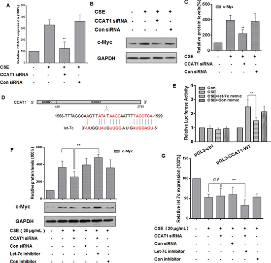 Figure 5: CCAT1 is involved in the CSE-induced elevation of c-Myc expression though let-7c in HBE cells. Densities of bands were quantified by Eagle Eye II software. GAPDH levels, measured in parallel, served as controls. HBE cells were cultured in the presence of control siRNA or CCAT1 siRNA (100 ppm) for 24 h and then exposed to CSE (20 μg/mL) for 24 h. (A) The levels (means ± SD, n = 3) of CCAT1 were determined by quantitative RT-PCR. (B) Western blots and (C) relative protein levels (means ± SD, n = 3) of c-Myc were determined. **P < 0.05, different from CSE-treated HBE cells in the absence of CCAT1 siRNA. (D) Predicted binding sites for let-7c in CCAT1. HBE cells were co-transfected with pGL3-CCAT1-WT or pGL3-ctrl and with 50 nM let-7c mimic or control mimic for 24 h, then exposed to CSE (0 or 20 μg/mL) for 24 h. (E) Luciferase activity was measured at 24 h after transfection. Means of triplicate assays with standard deviations were presented. HBE cells were exposed to CSE (0 or 20 μg/mL) for 24 h after cells were co-transfected with CCAT1 siRNA and let-7c inhibitor for 24 h. (F) Western blots and relative protein levels (means ± SD, n = 3) of c-Myc were determined. **P < 0.05, different from CSE-treated HBE cells in the presence of CCAT1 siRNA. (G) The levels (means ± SD, n = 3) of let-7c were determined by quantitative RT-PCR. ** P < 0.05, different from CSE-treated HBE cells in the presence of CCAT1 siRNA. ‘n.s.’ indicates no significant difference from CSE-treated HBE cells in the presence of CCAT1 siRNA.