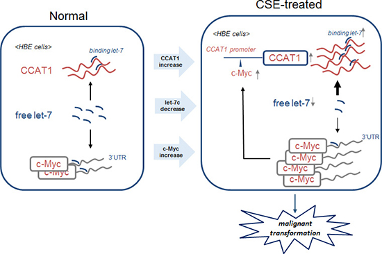 Further, in CSE-induced neoplastic transformation of HBE cells, over-expression of c-Myc increases CCAT1 expression through binding to its promoter region; in turn, CCAT1 increases c-Myc expression by binding free let-7c, which negatively regulates the expression of c-Myc through binding to its 3′-UTR (Figure 7). These results provide evidence that a positive feedback loop is formed to ensure CSE-induced CCAT1 and c-Myc expression, which are involved in transformation of cells and carcinogenesis.