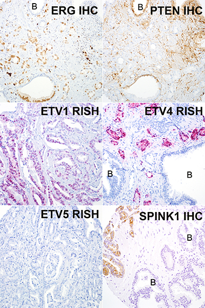 Figure 2: Representative images of ERG, PTEN, and SPINK1 immunohistochemistry (IHC) and ETV1/4/5 RNA in situ hybridization (RISH). ERG and PTEN immunostaining are shown from the same case, which expresses ERG (nuclear brown) and has lost PTEN expression in tumor cells, with retained expression in neighboring benign glands (denoted by a B). ETV1 and ETV4 RISH are from two representative positive cases (granular red staining) and are expressed in tumor glands, but not in intermingled benign glands (denoted by a B). ETV5 was negative in all cases. SPINK1 IHC is positive in a representative tumor case and negative in nearby benign glands (denoted by a B). Images at 200x magnification.