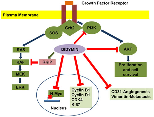Figure 3: Effect of didymin on neuroblastoma signaling pathways. Didymin inhibits N-Myc transcription, down-regulates PI3K, Akt, vimentin, and up-regulates RKIP. Didymin also down-regulates cyclin D1, CDK4 and cyclin B1, which is a down-stream effector of p53 mediated cell-cycle regulation. Didymin decreases expression of the angiogenic marker CD31, proliferation marker Ki67, and N-Myc in vivo as revealed by histopathological examination of resected tumors. Blue -Normal signal transduction, Green-Up regulation of signaling protein, Red-Inhibitory effect of didymin.