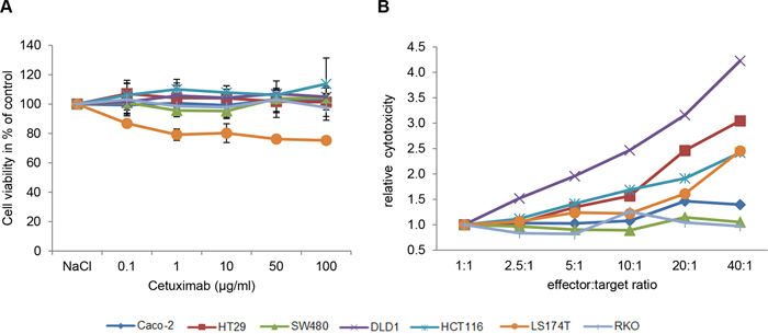 As expected for mAb-based treatment in vitro, mere incubation of CRC cells with different concentrations of Cetuximab (0.1, 1, 10, 50 and 100 μg/ml) had almost no effect on cell viability in any of the investigated CRC cell lines. In this setting, the strongest response was a 20% loss of cell viability in exclusively LS174T cells (Figure 1A).