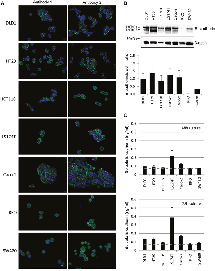 To investigate soluble levels of E-cadherin, cell culture supernatants of the 7 cell lines were additionally examined by ELISA at 48 and 72 hours (Figure 3C). Thereby, low levels of soluble E-cadherin were detected in RKO and SW480 cells, whilst moderate soluble E-cadherin levels with a slight increase at 72 hours of cultivation were seen in ascending order in HCT116, DLD1, HT29, Caco-2 and LS174T cells.