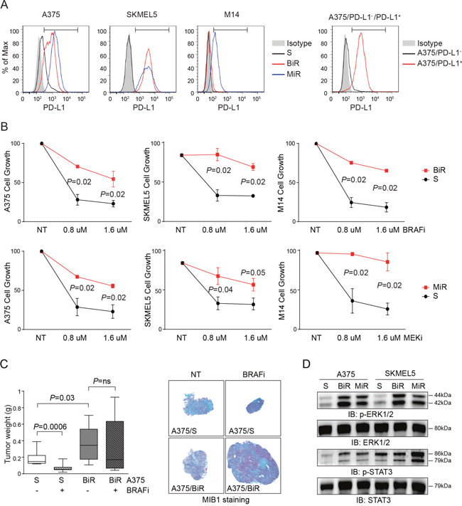 Figure 1: Establishment and characterization of BRAFV600E-mutated melanoma cell lines resistant to BRAFi and MEKi. A. Flow-cytometric histogram plots reporting surface expression of PD-L1 by A375, A375/PD-L1+, SKMEL5, M14 cell lines, before (S cells) and after the acquisition of resistance to BRAFi (BiR) and MEKi (MiR). The bars within the histogram plot define the positive cut-off. B. Cell growth of A375, SKMEL5 and M14 melanoma cell lines sensitive (black line) or resistant (red line) to BRAFi (Dabrafenib) or MEKi (Pimasertib) used at scalar doses for 72 hours as measured by MTT assay. Data are represented as % of control (untreated cells). Data from 3 independent experiments, each performed in triplicate. C. Box plot showing tumor weight (g) of A375/S or /BiR cells after subcutaneous injection of 107 cells in matrigel in NOD/SCID mice (n=5). Cells were left to grow for 14 days before beginning treatment with BRAFi (30 mg/kg/daily gavage) for 1 week. Mice were then sacrificed and lesions stained for MIB1 to determine the proliferative fraction (representative images are shown). Original magnification x2.5 (left panels), scale bar 50 μm. D. Western blot analysis of p-ERK1/2 and pSTAT3, and the corresponding total protein of A375 and SKMEL5 S, BiR and MiR. S: sensitive, BiR: BRAFi resistant, MiR: MEKi resistant.