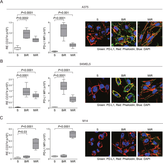 MiR cell lines were characterized by a robust up-modulation of CD274/PD-L1, both at the mRNA and protein levels (Figure 2A-2C). Among BiR lines, expression of PD-L1 increased in A375 (from 20% to 100%) and SKMEL5 (from 0% to 100%), while M14 remained PD-L1- (Figure 2A-2C). Confocal microscopy and flow cytometry analyses confirmed that PD-L1 was intensely expressed at the cell surface (Figure 2A-2C and Figure 1A).
