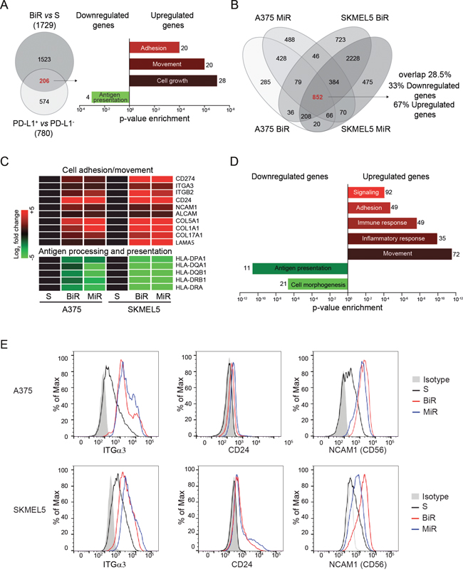Figure 3: PD-L1+ BRAFi or MEKi-resistant melanoma cells are characterized by a distinct genetic profile. A. Venn diagram showing genes commonly modulated when comparing A375/BiR cells to the A375/PD-L1+ clone. The histograms represent enriched gene categories obtained after analyzing the 206 common genes. B. Venn diagrams showing 852 common differentially expressed genes in BiR and MiR A375 and SKMEL5 cell lines obtained by RNAseq analysis. C. Most representative up-regulated (red) and down-regulated (green) differentially expressed genes belong to the common 852 genes. D. Histograms represent the more enriched GO categories in the resistant variants. E. Differential expression of integrin-α3 (ITGα3), CD24 and NCAM1 (CD56) protein of sensitive and BRAFi or MEKi-resistant melanoma cells by FACS analysis.