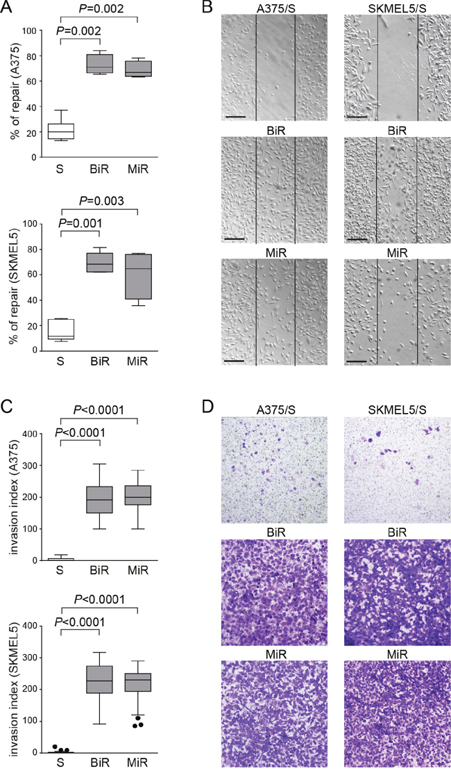 Following the gene expression profiles, we hypothesized that BiR and MiR cells would show a more aggressive behavior when compared to the drug-sensitive counterparts. Increased motility and aggressiveness of A375/PD-L1+ cells compared to A375/PD-L1- cells was previously confirmed both in vitro and in vivo [27]. We now extended these studies to A375 and SKMEL5 /BiR and /MiR, by analyzing their ability to repair wounds. Wound-healing assays performed at 48 hours clearly demonstrated that both /BiR and /MiR A375 and SKMEL5 cells repaired the wound in a more efficient way than the sensitive (S) counterpart (Figure 4A-4B). A375 cells showed a mean % of repair of 21±2.5% vs 73±4% of A375/BiR vs 69±3% of A375/MiR (Figure 4A-4B). SKMEL5 cells showed a mean of % of repair of 15±2.5% vs 69±4% of SKMEL5/BiR vs 60±9% of SKMEL5/MiR (Figure 4A-4B). Likewise BiR and MiR cells showed significantly increased chemotactic and invasive performances as compared to the S counterparts (Figure 4C-4D and Supplementary Figure 1). Invasion index for A375 was 3.5±5 SD vs 193±51 SD of A375/BiR and 197±48 SD of A375/MiR. Invasion index for SKMEL5 was 1.7±3 SD vs 226±53 SD for SKMEL5/BiR and 213±50 SD for SKMEL5/MiR (Figure 4C).