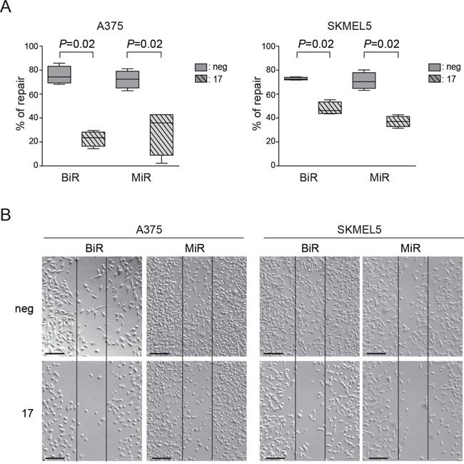 In agreement with results obtained after silencing PD-L1, transfection of miR-17-5p in BiR and MiR melanoma cells was followed by a markedly decreased ability to repair wounds, indirectly validating the role of PD-L1 in this process (Figure 7A-7B). In these experimental conditions, miR17-5p levels rose sharply upon transfection (Supplementary Figure 3A).