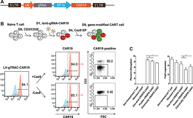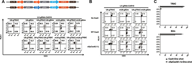 CD19-CAR was synthesized and subcloned into pTRPE lentiviral vectors, and the one-shot system was constructed based on the lentiviral pTRPE-CD19-CAR by adding gRNA sequence under the control of different promoters.