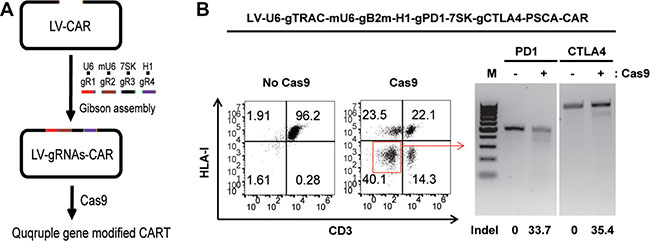 Figure 5: Generating dual inhibitory resistant universal PSCA-CAR T cells by quadruple gene ablation. (A) A rapid protocol to generate quadruple genetically modified CAR T cells with the one-shot CRISPR system. (B) Generation of TCR, HLA-I, PD1and CTLA-4 quadruple gene-disrupted PSCA-CAR T cells. TCR and HLA-I disruption was confirmed by flow cytometry. PD1 and CTLA-4 ablation was confirmed by a T7E1 assay. The percent of gene disruption was calculated and listed with an underline.