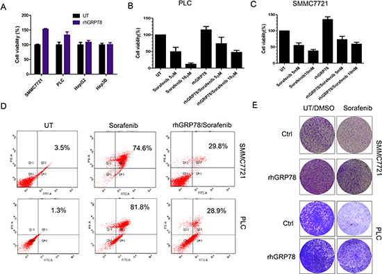 Figure 2: Secreted GRP78 promoted the proliferation of HCC cells and inhibited the sensitivity of HCC cells to sorafenib in vitro. (A) MTT analysis of the effect of secreted GRP78 on the proliferation of HCC cells. The experiment was repeated three times in triplicate. The values were presented as mean ± SD. (B, C) MTT analysis of the effect of secreted GRP78 on the sensitivity to sorafenib in HCC cells in a short term (48 h). The experiment was repeated three times in triplicate. The values were presented as mean ± SD. (D) Flow cytometry analysis of the effect of secreted GRP78 on the apoptosis induced by sorafenib. The status of apoptosis was represented by the percentage of apoptotic cells (%). (E) Colony formation analysis of the effect of secreted GRP78 on the proliferation and the sensitivity to sorafenib in HCC cells in a long term (14 days). The experiment was repeated three times in triplicate.