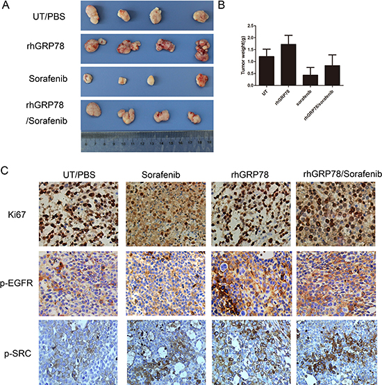All animal experiments were approved and supervised by the Animal Care and Use Committees of Jinzhou Medical University. SMMC7721 cells 107 in 200 μL phosphate-buffered saline were injected subcutaneously to both sides of the dorsal midline in nude mice. Once the tumors reached 80–100 mm3 at day 7, mice were randomly divided into four groups: (1), control group (2), rhGRP78 treated group. Mice in this group were treated with rhGRP78 (400 μg/Kg) by intraperitoneal injection once every three days for two weeks. (3). Sorafenib treated group. Mice in this group were treateded with sorafenib (30 mg/kg) by intragastric administration once every three days for two weeks. (4), rhGRP78/sorafenib treated group. Mice in this group were pretreated with rhGRP78 rhGRP78 (400 μg/kg) by intraperitoneal injection before the day of sorafenib administration (30 mg/kg) once every three days for 2 weeks. After two weeks, the xenografts were removed, the tumor weights were measured, and the expression of Ki67, p-EGFR, p-SRC were examined by immunostaining.