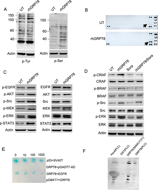 Figure 4: Secreted GRP78 interacted physically with EGFR and activated EGFR downstream signaling. (A) Western blot analysis of the effect of secreted GRP78 on the phosphorylation of tyrosine and serine in SMMC7721 cells. (B) phospho-RTK screening of the cell surface receptor tyrosine kinases in SMMC7721 cells treated with rhGRP78. (C) Western blot analysis of the phosphorylation status of EGFR downstream signaling molecules including AKT, SRC, STAT3, MEK and ERK. (D) Western blot analysis of the phosphorylation status of BRAF, CRAF, SRC and ERK in SMMC7721 cells treated with rhGRP78, sorafeinib, rhGRP78/sorafenib. (E) Yeast two-hybridization screening of the binding partners on the cell surface of SMMC7721 cells using GRP78 as the bait. p53/SV40T was used as the positive control. (F) GST pulldown analysis of the interaction between secreted GRP78 and EGFR using rhGRP78 as the bait.